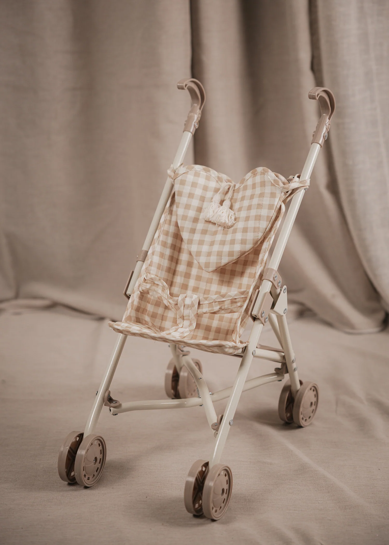 Tento krásný kočárek je vyroben z pevné kovové konstrukce, která zajišťuje dlouhou životnost a stabilitu díky dvojitým kolečkům na každé noze. Textilní části jsou ušity z organické bavlny a lze je snadno odejmout pro pohodlné čištění.